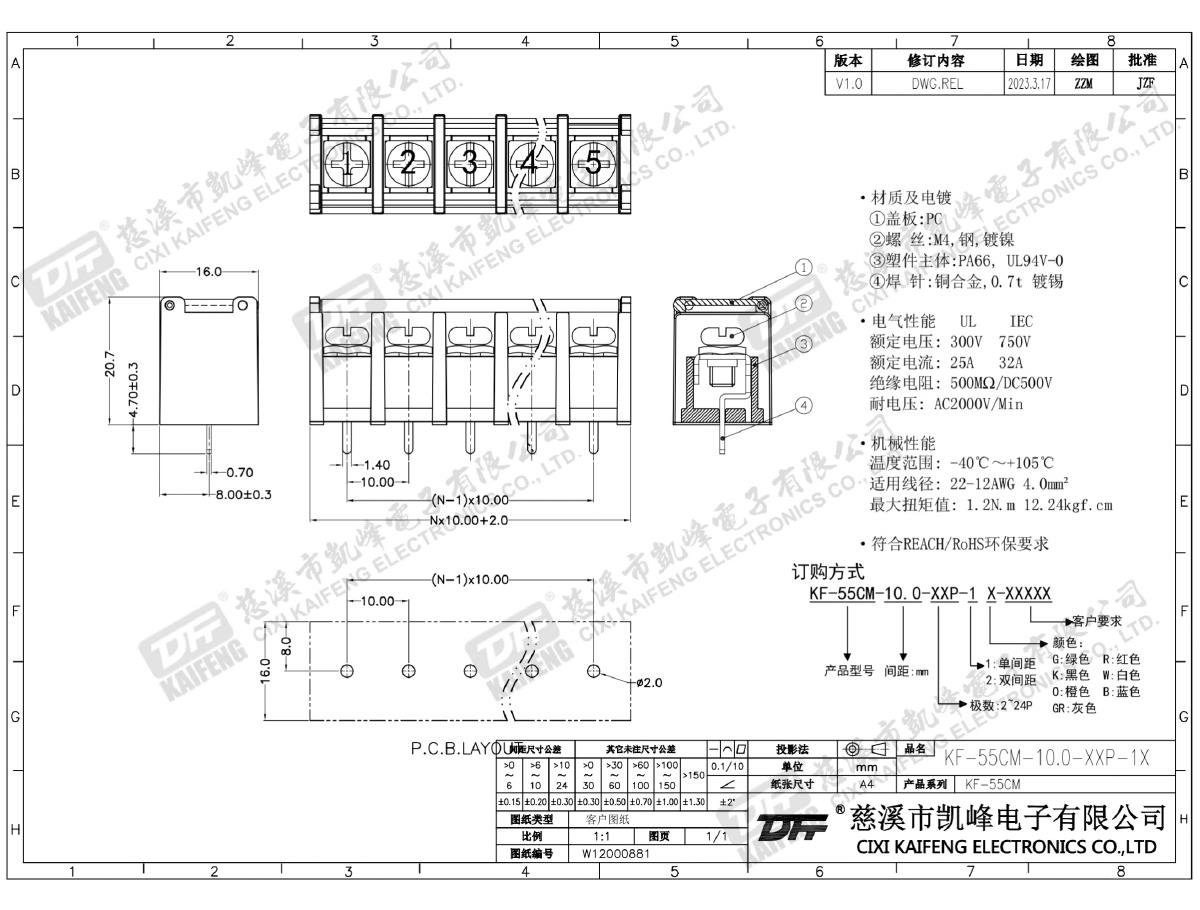 柵欄式接線端子 材質(zhì)電鍍:M4.0 鋼,鍍鎳端子:黃銅,0.8t 鍍鎳塑件: PA66,UL94V-0電氣性能ULIEC額定電壓300V 750V 額定電流25A32A絕緣電阻500MΩ/DC500V耐電壓AC2000V/1min使用線徑22-12AWG 4.0mm2機(jī)械性能溫度范圍-40℃~+105℃ 扭矩1.2N.m 10.53Lb.in