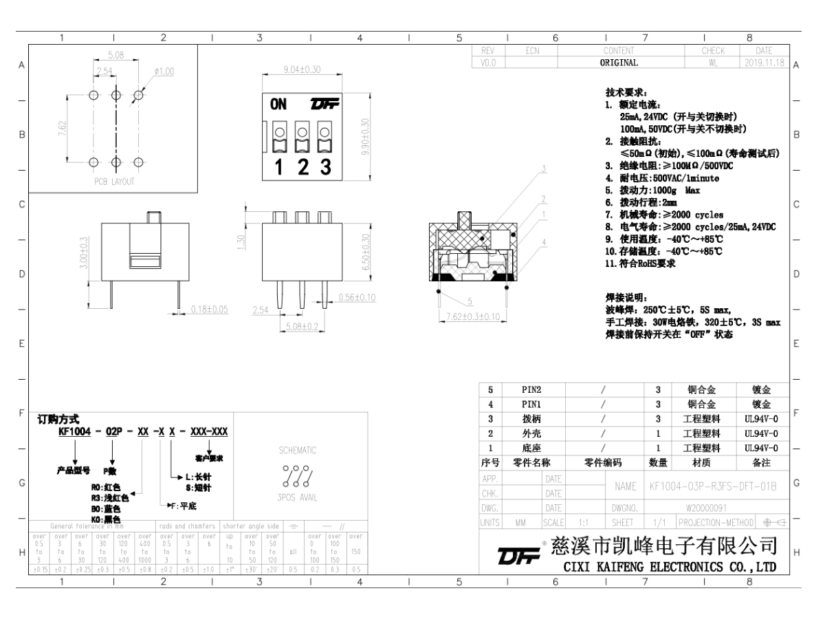 撥碼開關(guān) 材質(zhì)電鍍:UL94V-0 工程塑料,黑色 上蓋:UL94V-0 工程塑料,紅色 藍(lán)色 黑色 推鈕:UL94V-0 工程塑料,白色端子:磷青銅鍍金 電氣性能電氣壽命:在電壓24VDC電流25mA之下測試,可來回?fù)軇?000次開關(guān)不常切換的額定電流:100mA,耐壓50VDC開關(guān)經(jīng)常切換