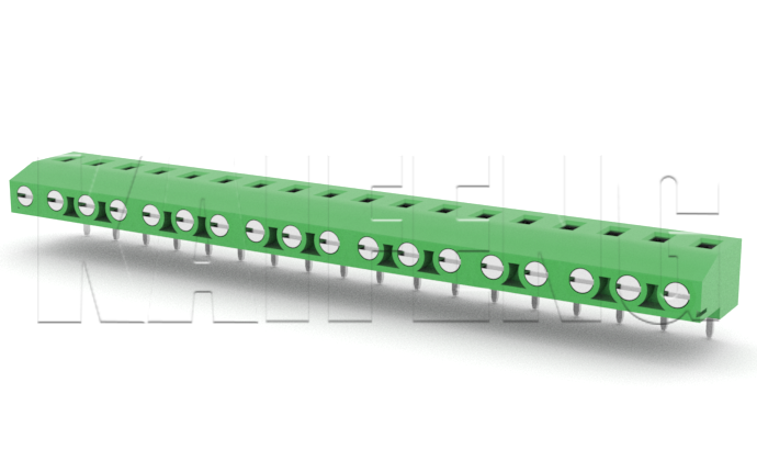 PCB Terminal Block MATERIAL:Screws:M3steel,Ni platedContact material:BrassPin header:Brass, Tin platedHousing:PA66UL94V-0·MechanicalTemp.rang:-40℃~+105℃Max.soldering:+250℃5S torque:0.4Nm(3.6lb.in)Strip length:6-7mm·ELECTRICALRated voltage:300VRated current:20AContact resistance:20m?Insulation resistance:5000M?\1000VWithstanding voltage :AC1500V\1MinWire range:24-12AWG2.5mm2