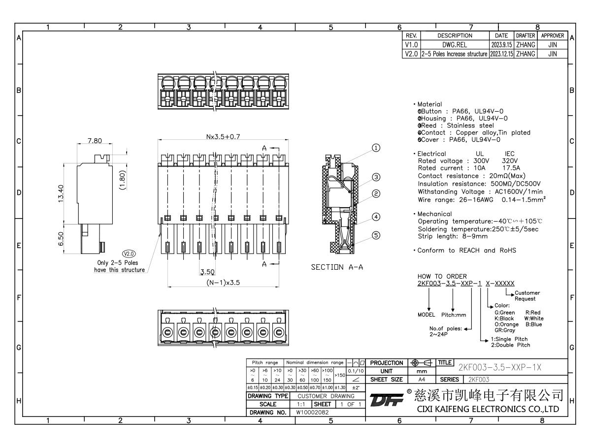 Pluggable Terminal Block MATERIAL:①Reed:PA66,UL94V-0 ②Clip : Stainless steel3 Button:Phosphor bronzeElectricalUL IEC Rated voltage300V 320V &