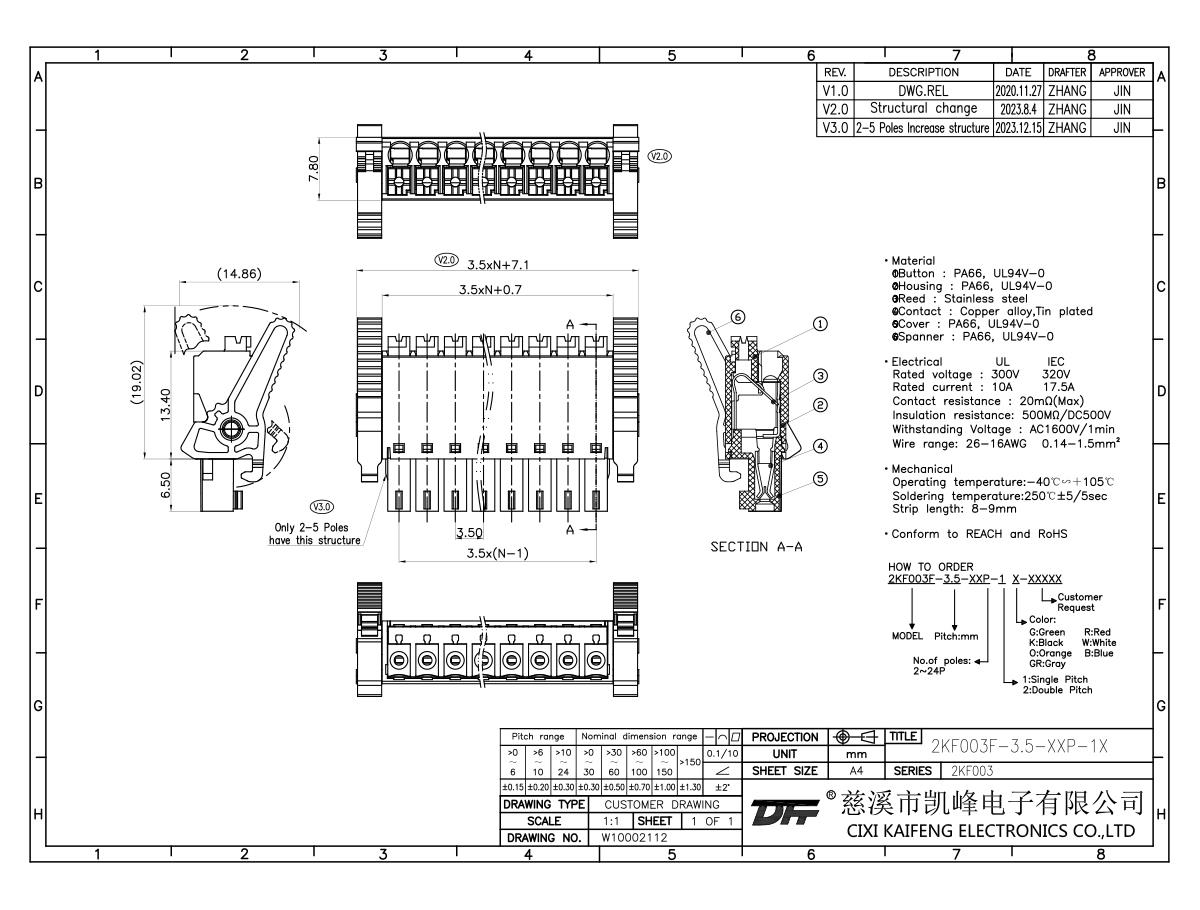 Pluggable Terminal Block MATERIAL:①Reed:PA66,UL94V-0 ②Clip : Stainless steel3 Button:Phosphor bronzeElectricalUL IEC Rated voltage300V 320V &
