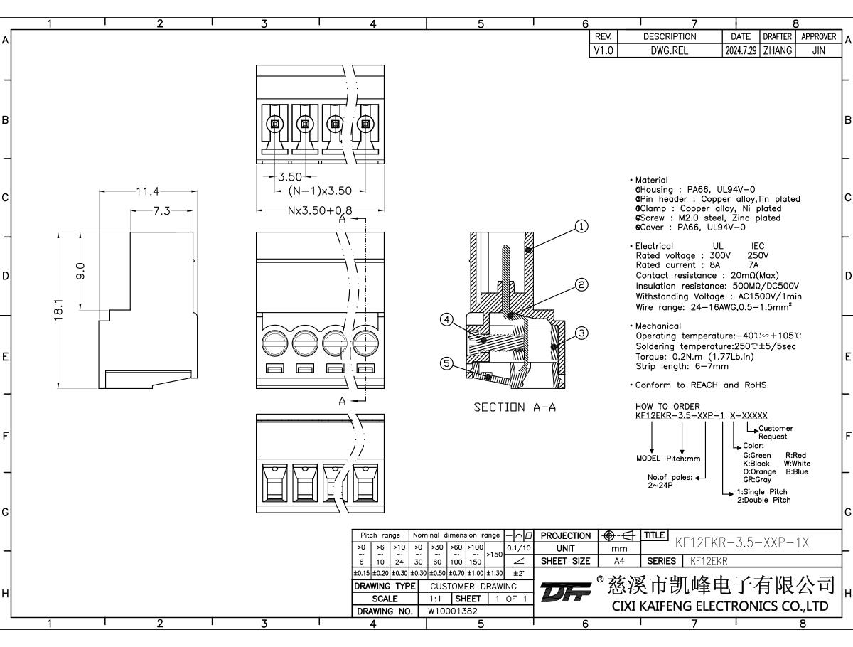 Pluggable Terminal Block MATERIAL:M2.5,Steel Zinc platedClip:Phosphor bronze,Tin Platedcontact:Brass,Tin PlatedHousing:PA66,UL94V-0ElectricalULIECRated voltage300V250VRated current8A7AContact resistance20mΩInsulation resistance500MΩ/DC500VWithstanding voltage AC1500V/1minWire range26-28AWG0.5-1.5mm2MechanicalTemp.rang-40℃~+105℃Max.soldering+250℃,5secTorque0.2N.m2.4kgf.cmStrip length6-7mm