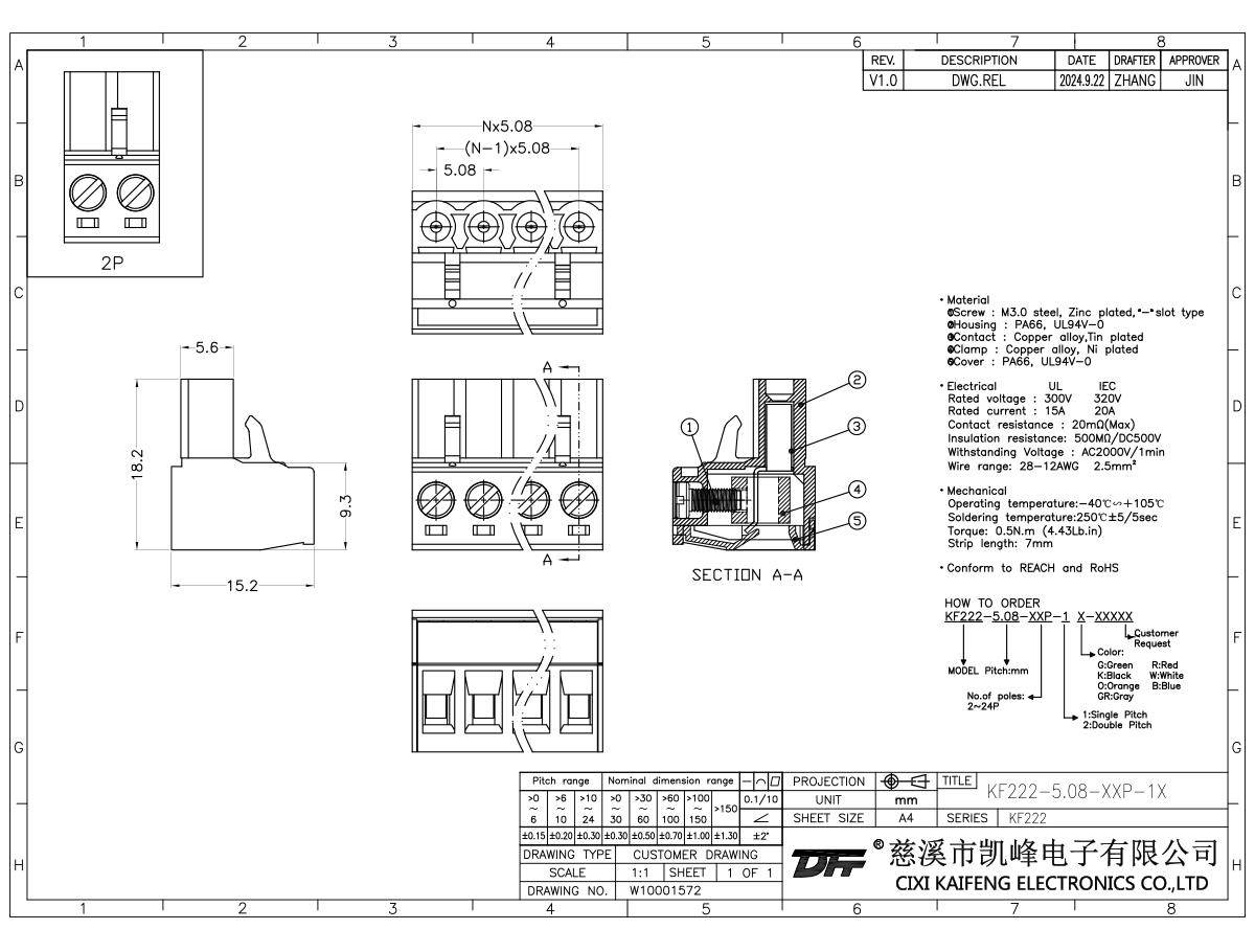 Pluggable Terminal Block MATERIAL:MATERIALScrews: M2.5,Steel Zinc platedcontact: Phosphor bronzePin header: -Housing: PA66,UL94V-0ElectricalULIECRated voltage300V 320V Rated current15A20AContact resistance20mΩInsulation resistance500MΩ/DC500VWithstanding voltage AC2000V/1minWire range28-12AWG 2.5mm2MechanicalTemp.rang-40℃~+105℃ Max.soldering+250℃, 5s