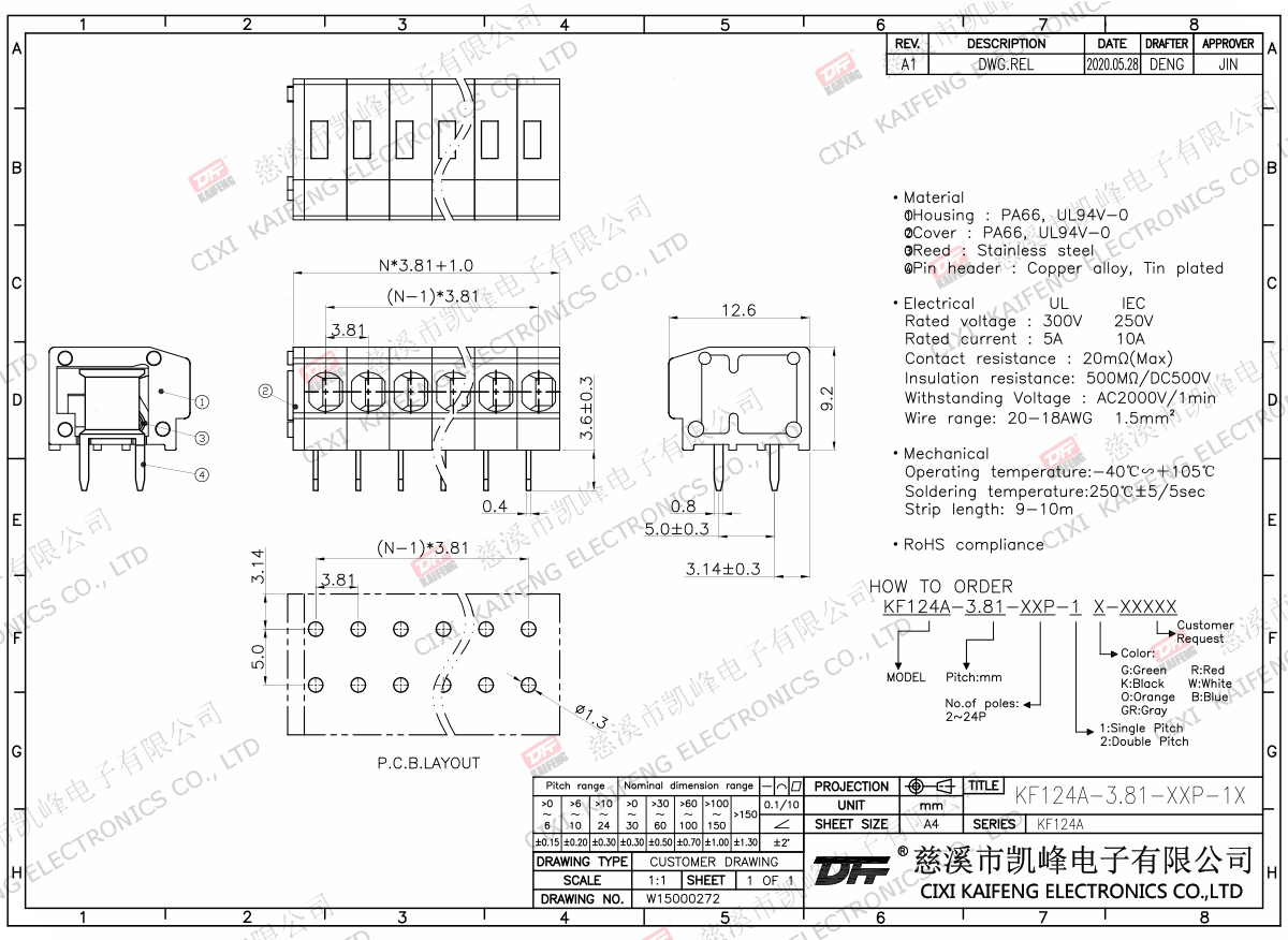 Material:①Button:PA66,UL94V-0②Cover:PA66,UL94V-0③Reed:Stainless steel④Pin header:Brass,Tin platedElectricalULIECRated voltage300V 250V Rated current5A10AContact resistance20mΩInsulation resistance500MΩ/DC500VWithstanding voltage AC2000V/1minWire range20-18AWG 1.5mm2MechanlicalTemp.rang-40℃~+105℃ Max.soldering+250℃,5secTorque-Strip length9-10mm