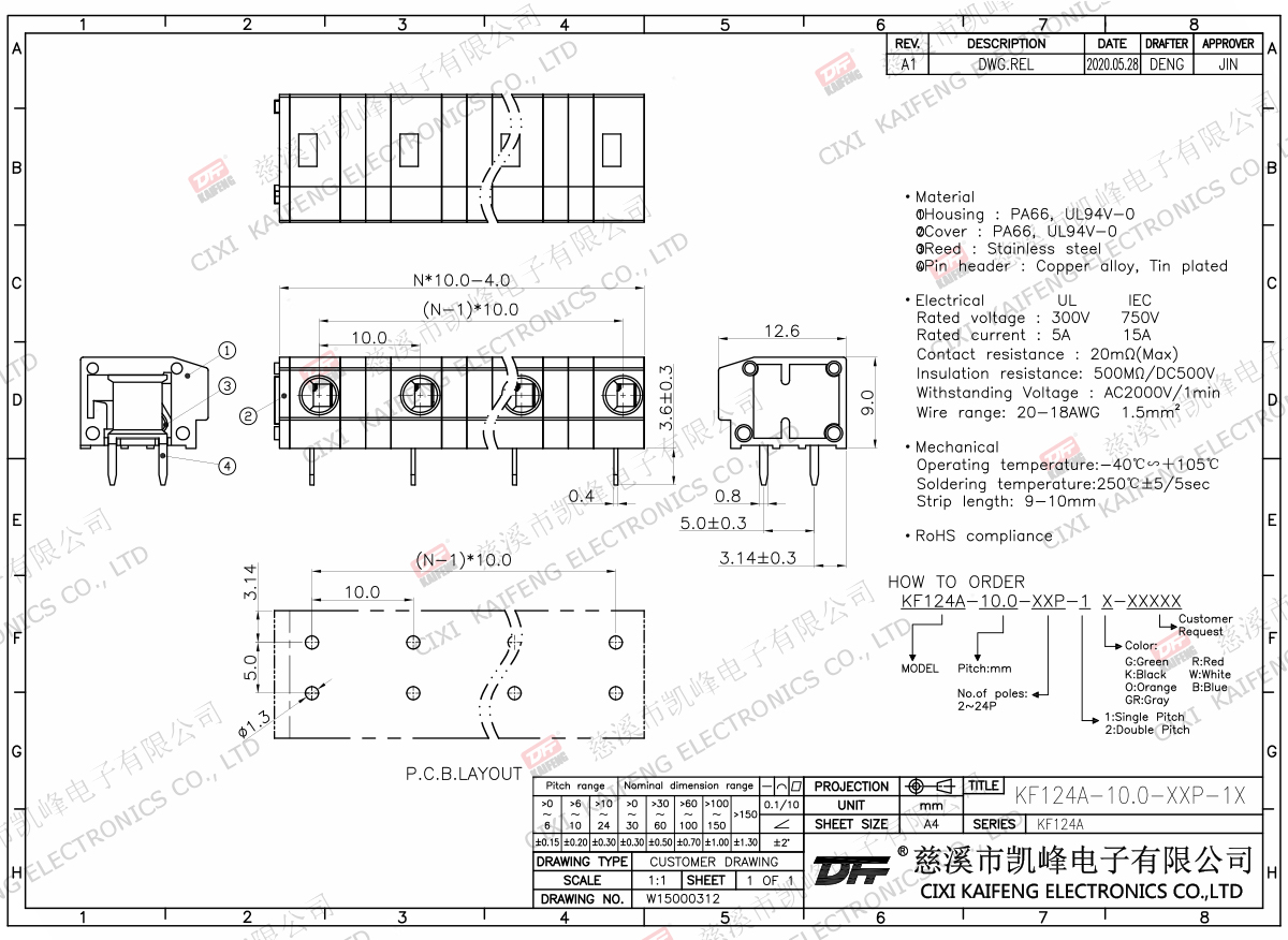 Material:①Button:PA66,UL94V-0②Cover:PA66,UL94V-0③Reed:Stainless steel④Pin header:Brass,Tin platedElectricalULIECRated voltage300V 250V Rated current5A10AContact resistance20mΩInsulation resistance500MΩ/DC500VWithstanding voltage AC2000V/1minWire range20-18AWG 1.5mm2MechanlicalTemp.rang-40℃~+105℃ Max.soldering+250℃,5secTorque-Strip length9-10mm