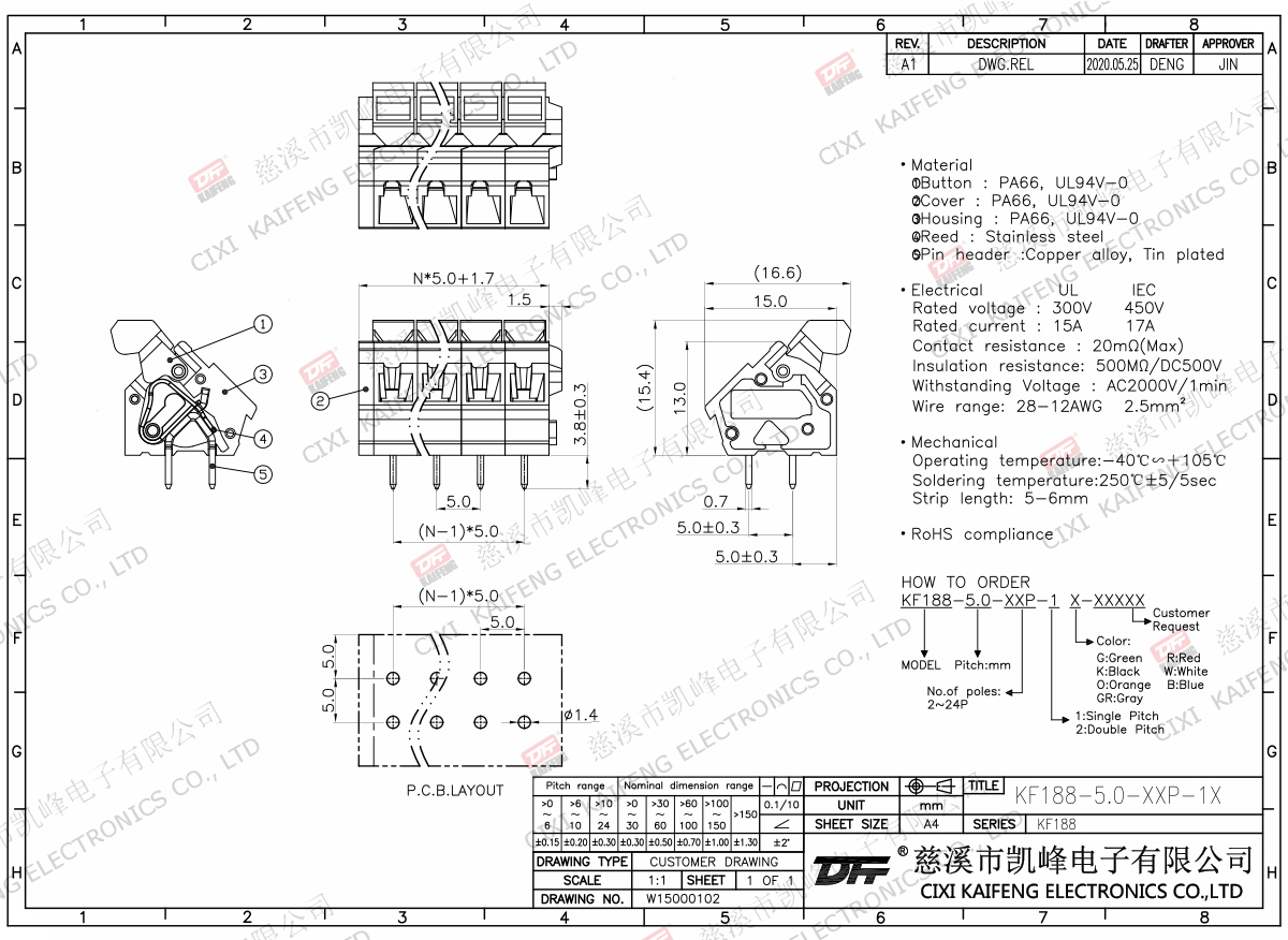 Terminal Material:①Button:PA66,UL94V-0②Cover:PA66,UL94V-0③Button:PA66,UL94V-0④Reed:Stainless steel⑤Pin header:Brass,Tin platedElectricalULIECRated voltage300V 450VRated current15A17AContact resistance20mΩInsulation resistance500MΩ/DC500VWithstanding voltage AC2000V/1minWire range28-12AWG 2.5mm2MechanlicalTemp.rang-40℃~+105℃