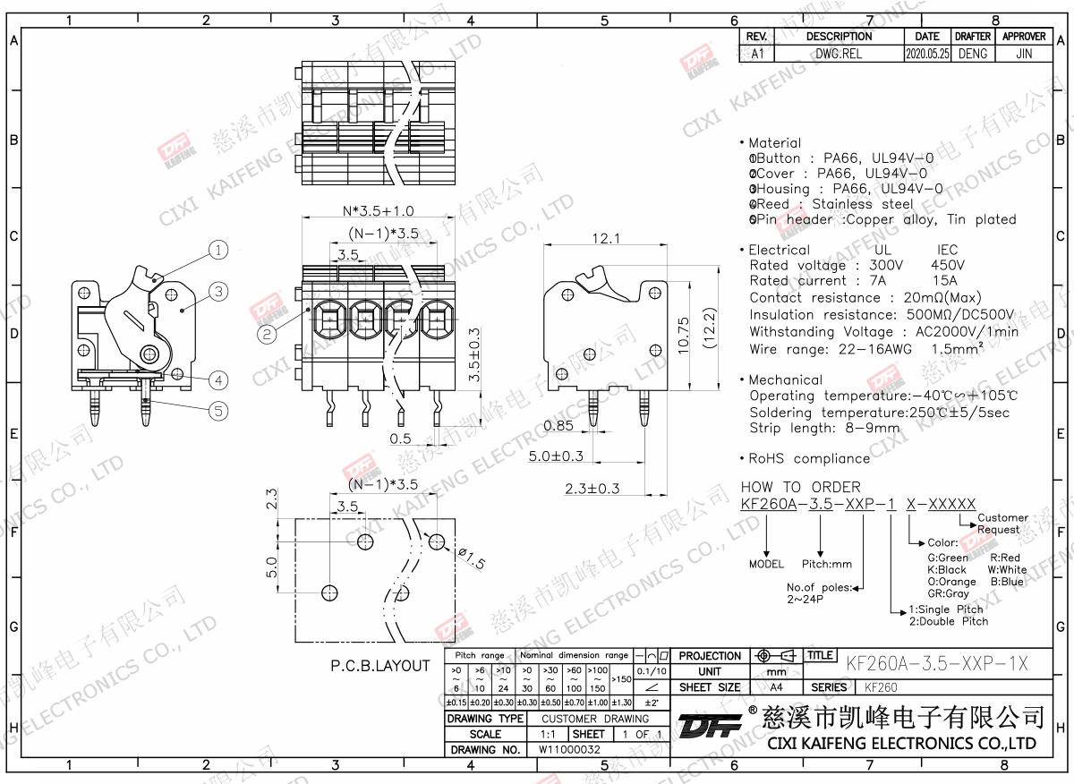 Terminal Material:①Button:PA66,UL94V-0②Cover:PA66,UL94V-0③Button:PA66,UL94V-0④Reed:Stainless steel⑤Pin header:Brass,Tin platedElectricalULIECRated voltage300V 450V Rated current7A15AContact resistance20mΩInsulation resistance500MΩ/DC500VWithstanding voltage AC2000V/1minWire range22-16AWG 1.5mm2MechanlicalTemp.rang-40℃~+105℃ Max.soldering+2