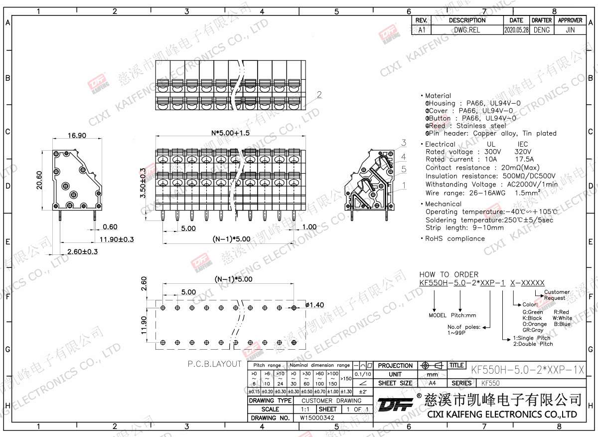 Material:Material:①Housing:PA66,UL94V-0②Cover:PA66,UL94V-0③Cover:PA66,UL94V-0④Button:PA66,UL94V-0⑤Reed:Stainless steel⑥Long welding leg:Red copper,Tin plated⑦Short welding leg:Red copper,Tin platedElectricalULIECRated voltage300V 320V Rated current10A17.5AContact resistance20mΩInsulation resistance500MΩ/DC500VWithstanding voltage AC2000V/1minWire range26-16AWG 1.5mm2