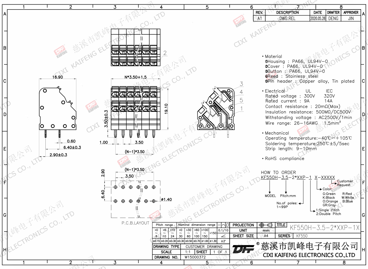Material:Material:①Housing:PA66,UL94V-0②Cover:PA66,UL94V-0③Cover:PA66,UL94V-0④Button:PA66,UL94V-0⑤Reed:Stainless steel⑥Long welding leg:Red copper,Tin plated⑦Short welding leg:Red copper,Tin platedElectricalULIECRated voltage300V 320V Rated current10A17.5AContact resistance20mΩInsulation resistance500MΩ/DC500VWithstanding voltage AC2000V/1minWire range26-16AWG 1.5mm2
