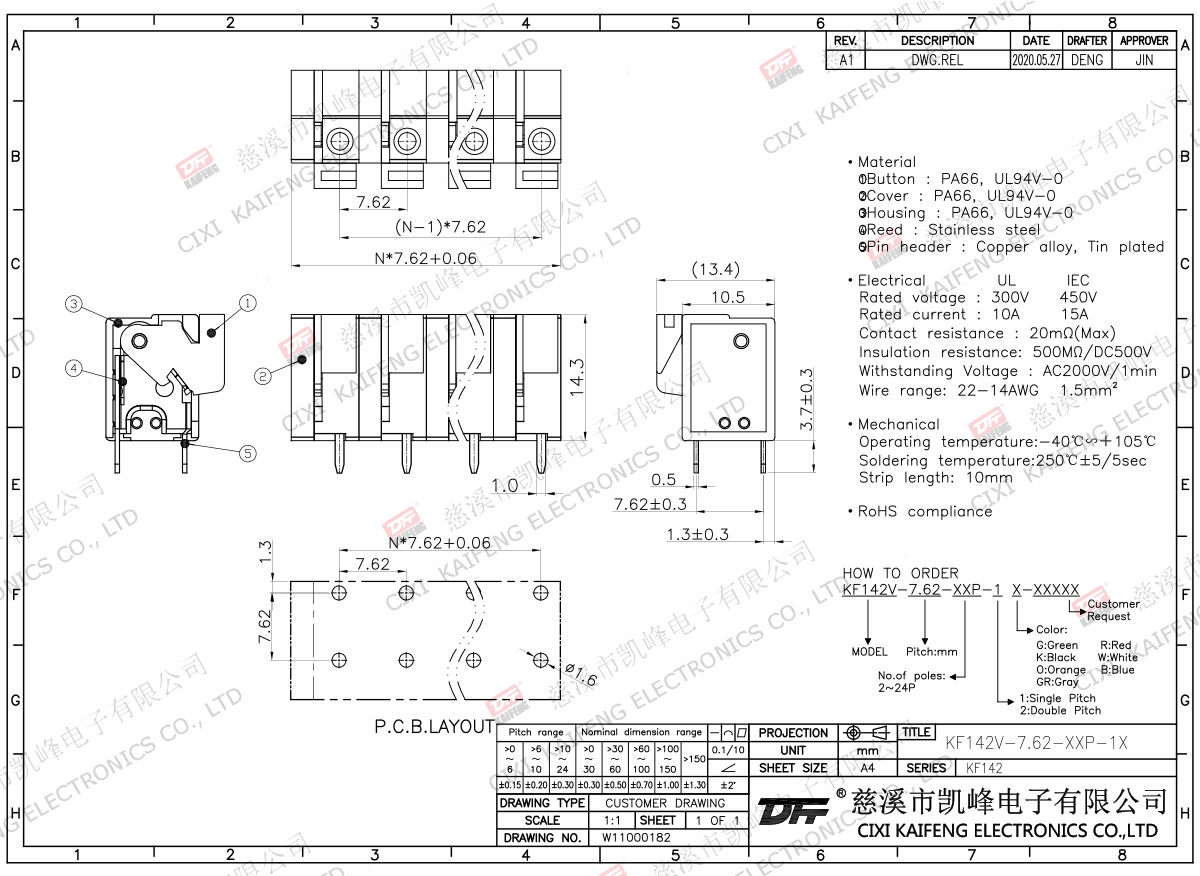 Material:①Button:PA66,UL94V-0②Cover:PA66,UL94V-0③Button:PA66,UL94V-0④Reed:Stainless steel⑤Pin header:Brass,Tin platedElectricalULIECRated voltage300V 250V Rated current10A15AContact resistance20mΩInsulation resistance500MΩ/DC500VWithstanding voltage AC2000V/1minWire range22-14AWG 1.5mm2MechanlicalTemp.rang-40℃~+105℃ Max.soldering+250℃,5sec