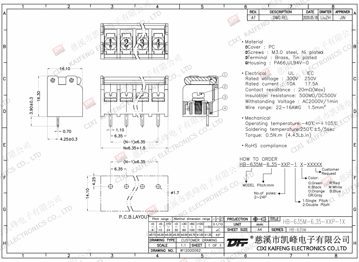 Material:M2.5 Steel,Ni platedTerminal:Brass,0.7t Ni platedHousing: PA66,UL94V-0ElectricalULIECRated voltage300V 250V Rated current10A17.5AInsulation resistance500MΩ/DC500VWithstanding voltage AC2000V/1minWire range22-16AWG 1.5mm2MechanlicalTemp.rang-40℃~+105℃ Torque0.4N.m 3.54Lb.in
