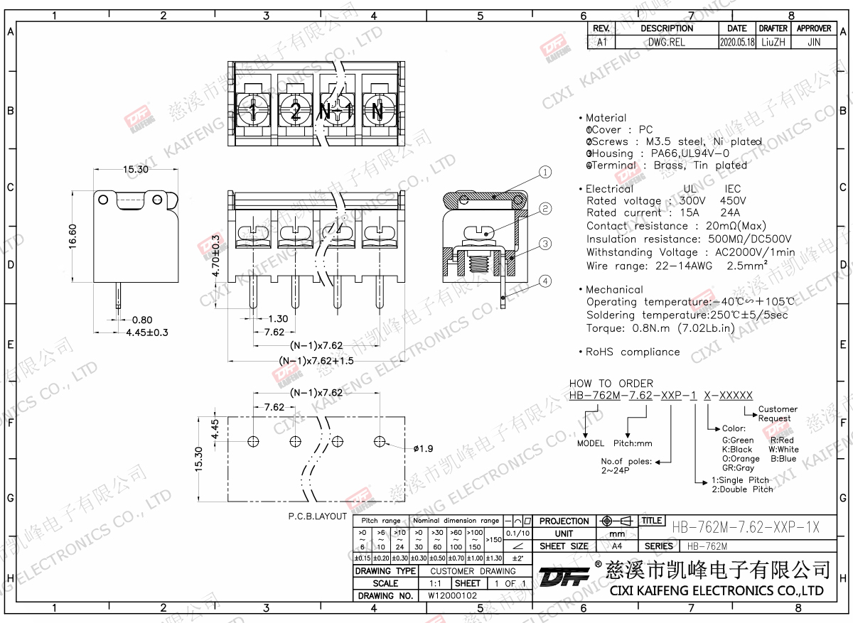 Material:M3.5 steel,Ni platedTerminal: Brass, 0.7t Tin PlatedHousing : PA66, UL94V-0ELECTRICALULIECRated voltage300V 450V Rated current15A24AInsulation resistance500MΩ/DC5