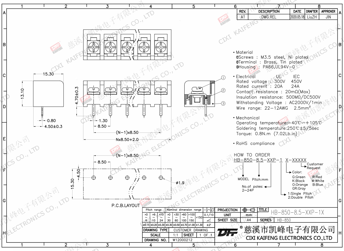 Material:M3.5 Steel,Ni platedTerminal:Brass,0.7t Ni platedHousing: PA66,UL94V-0ElectricalULIECRated voltage300V 450V Rated current20A24AInsulation resistance500MΩ/DC500VWithstanding voltage AC2000V/1minWire range22-12AWG 2.5mm2MechanlicalTemp.rang-40℃~+105℃ Torque0.8N.m 7.02Lb.in