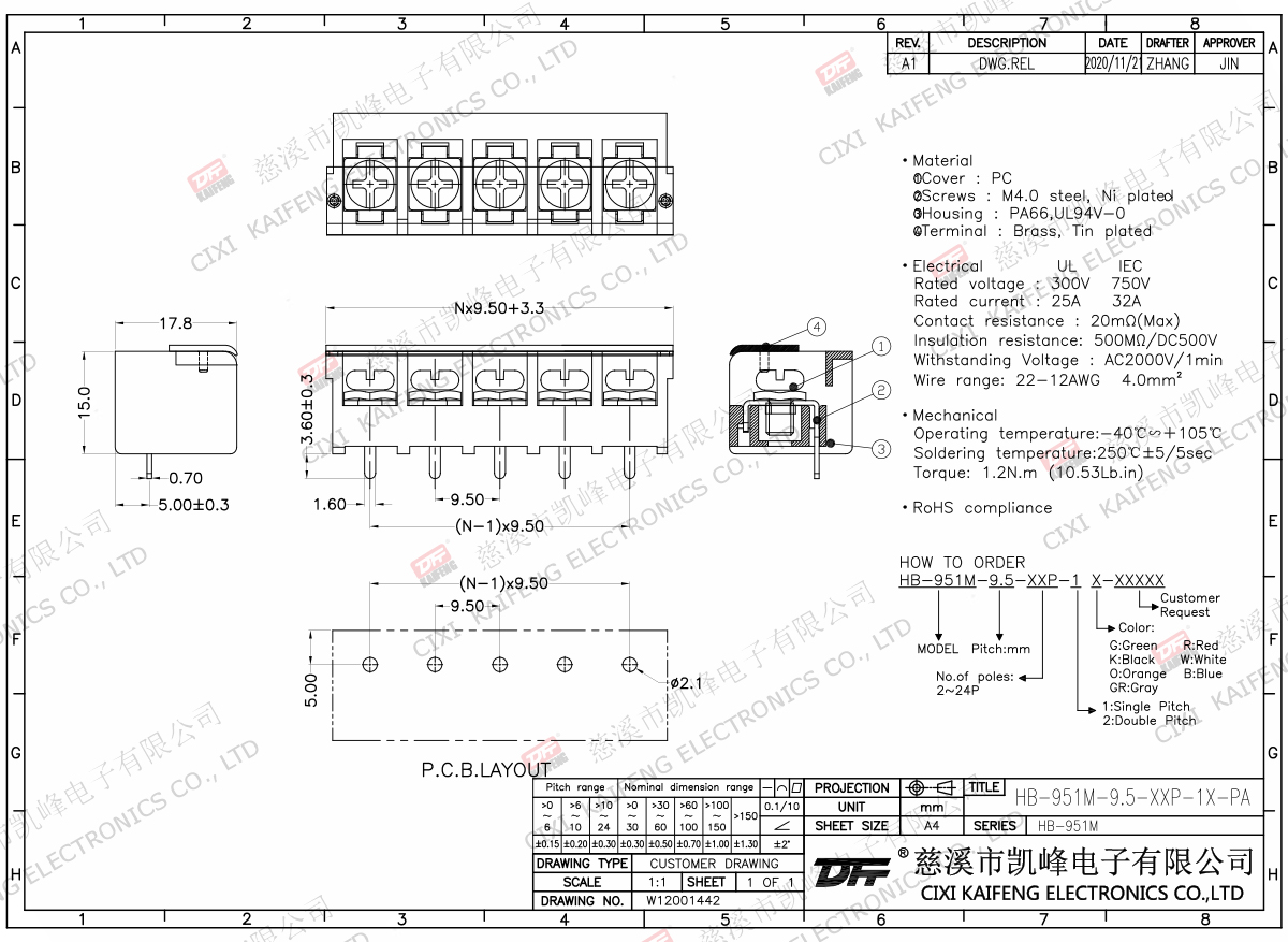 Material:Screws(Screw):M3.0,Steel,Ni platedSteel,NiPlatedTerminal(Pinheader):Brass,0.8tTin platedBrass,TinplatedHousing(Housing):PA66,UL94V-0·Electrical(Electrical)Rated voltage(RatedVoltage):300VRated current(RatedCurrent):20AInsulation resistance