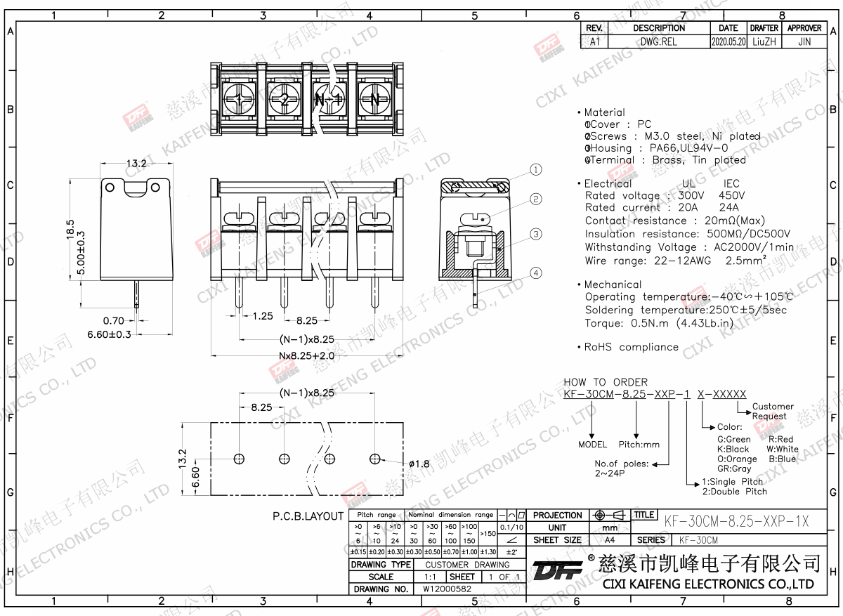 Material:M3.0 Steel,Ni platedTerminal:Brass,0.7t Ni platedHousing: PA66,UL94V-0ElectricalULIECRated voltage300V 450V Rated current20A24AInsulation resistance500MΩ/DC500VWithstanding voltage AC2000V/1minWire range22-12AWG 2.5mm2MechanlicalTemp.rang-40℃~+105℃ Torque0.5N.m 4.4Lb.in