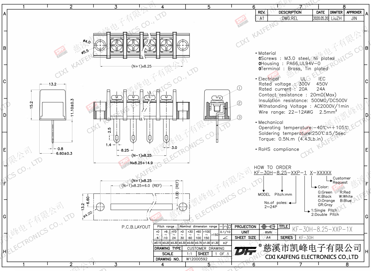 Material:M3.0 Steel,Ni platedTerminal:Brass,0.8t Ni platedHousing: PA66,UL94V-0ElectricalULIECRated voltage300V 450V Rated current20A24AInsulation resistance500MΩ/DC500VWithstanding voltage AC2000V/1minWire range22-12AWG 2.5mm2MechanlicalTemp.rang-40℃~+105℃ Torque0.5N.m 4.4Lb.in