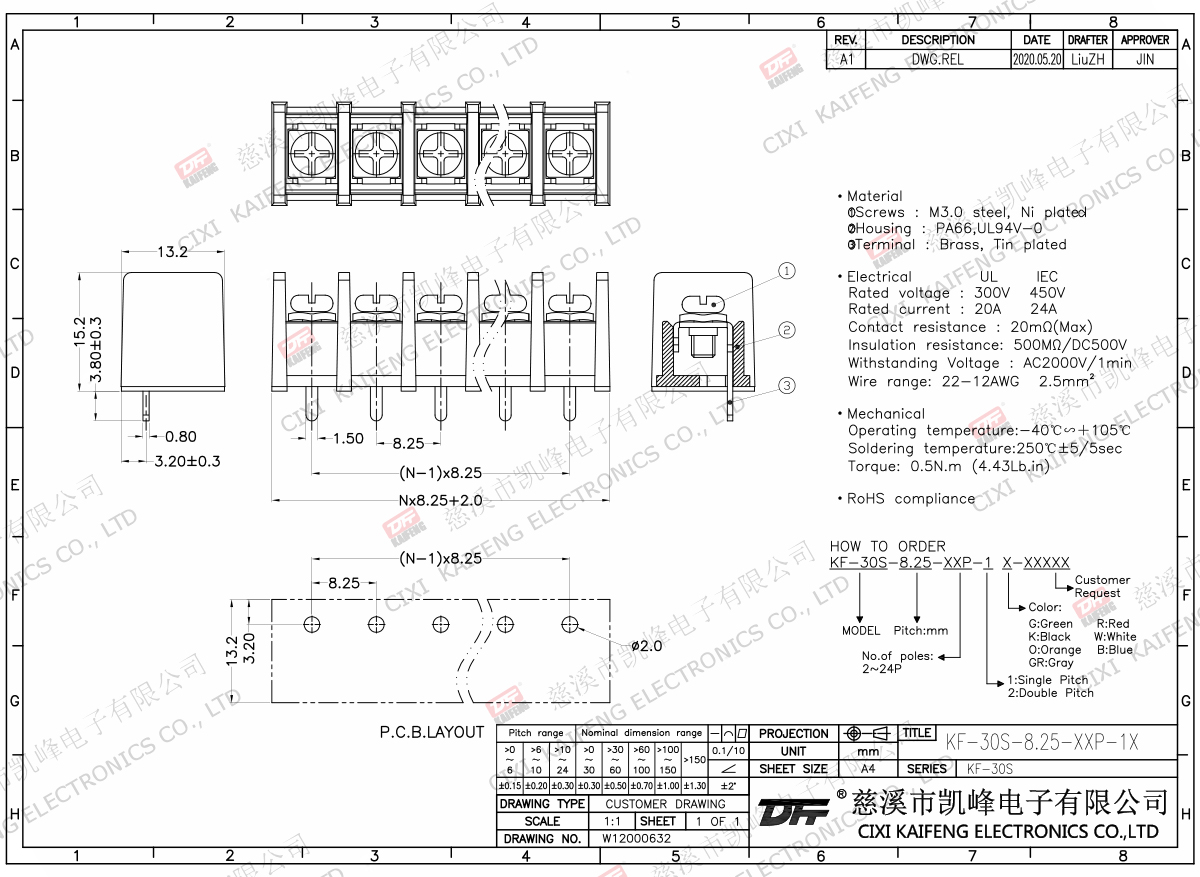 Material:M3.0 Steel,Ni platedTerminal:Brass,0.8t Ni platedHousing: PA66,UL94V-0ElectricalULIECRated voltage300V 450V Rated current20A24AInsulation resistance500MΩ/DC500VWithstanding voltage AC2000V/1minWire range22-12AWG 2.5mm2MechanlicalTemp.rang-40℃~+105℃ Torque0.5N.m 4.4Lb.in