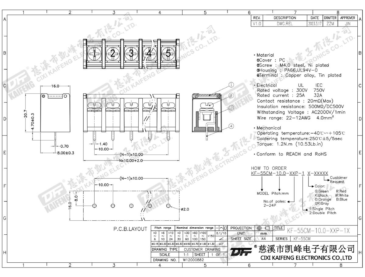 Material:M4.0 Steel,Ni platedTerminal:Brass,0.8t Ni platedHousing: PA66,UL94V-0ElectricalULIECRated voltage300V 750V Rated current25A32AInsulation resistance500MΩ/DC500VWithstanding voltage AC2000V/1minWire range22-12AWG 4.0mm2MechanlicalTemp.rang-40℃~+105℃ Torque1.2N.m 10.53Lb.in